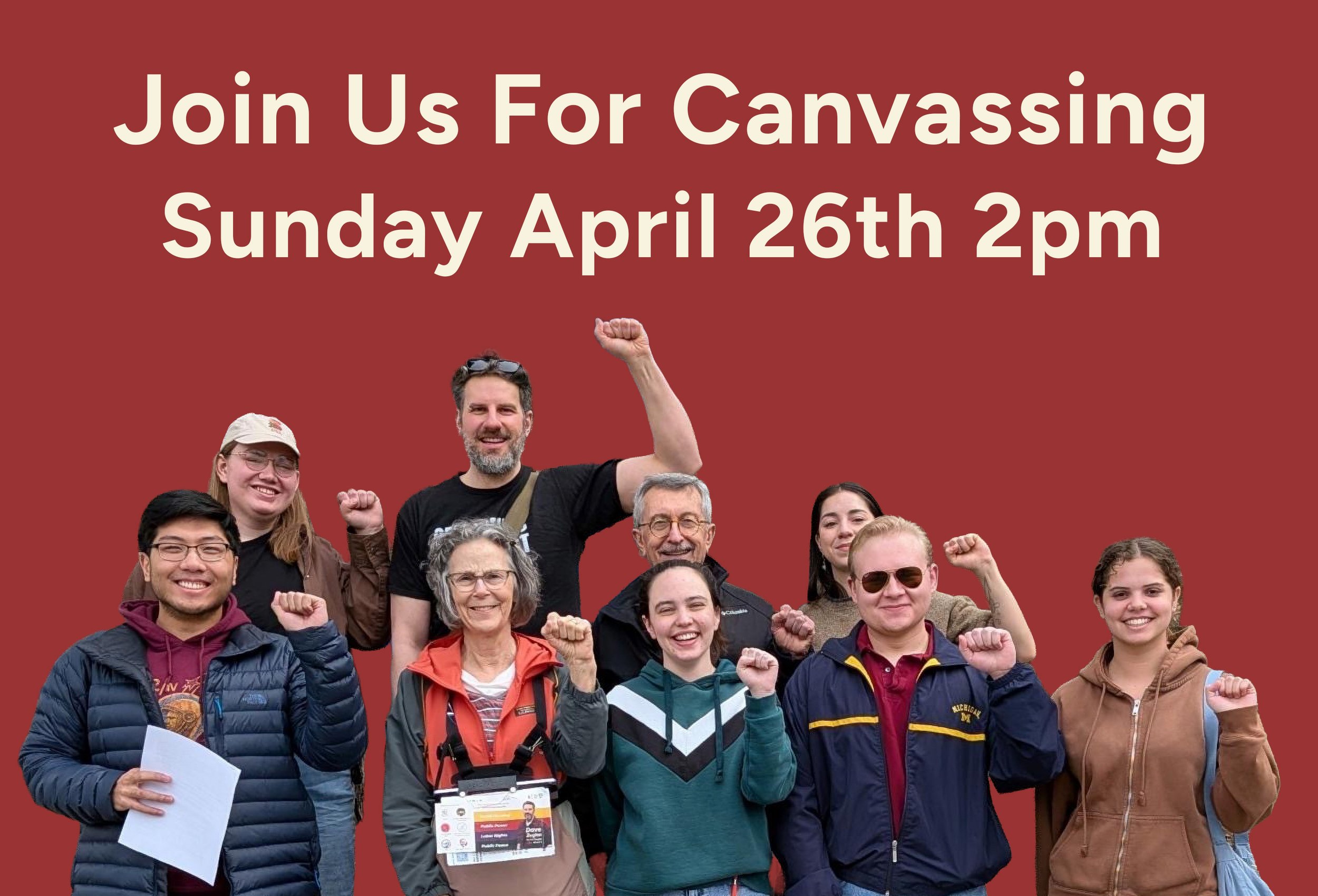 April 26th Canvass For Dave Sunday, April 26, 2026 2:00 PM 4:00 PM Clonlara School 1289 Jewett Ave Ann Arbor, MI 48104 United States (map) Google Calendar ICS RSVP: https://actionnetwork.org/events/april-26th-canvass-for-dave